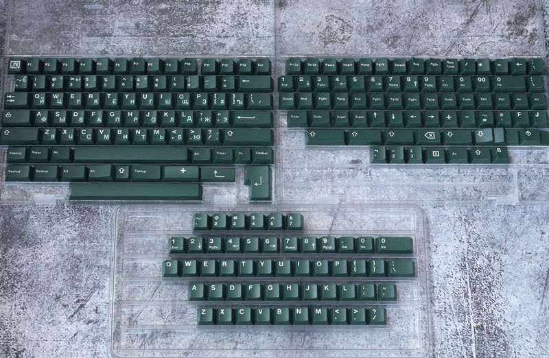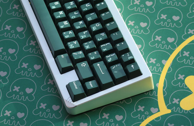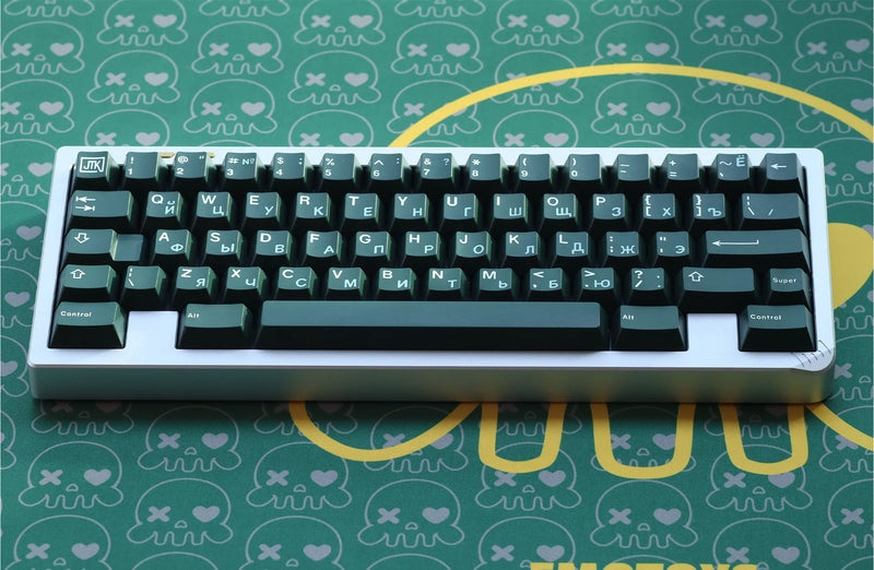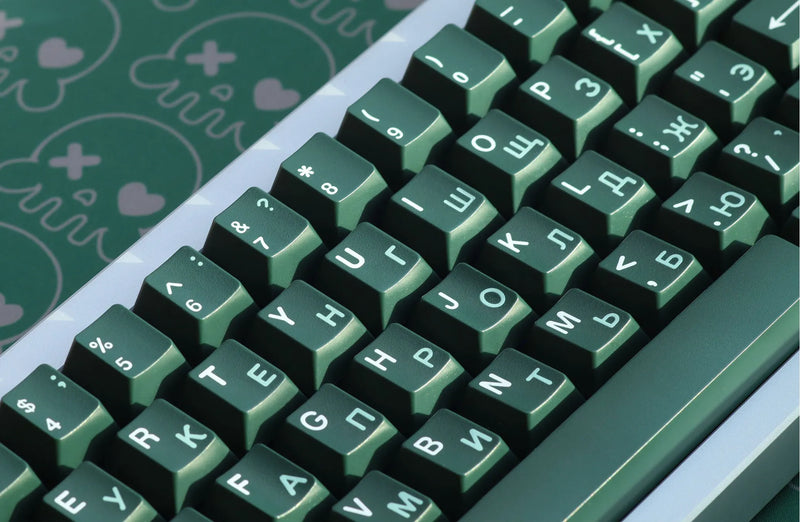 JTK Emerald Keycaps feature an iconic emerald color with white legends. These include both a Latin alpha set as well as a Russian alpha set. Russian sublegends showcase a mint color.