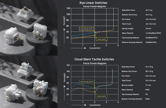 - Cloud Silent Tactile Switches: balanced switch between tactile feedback and noise reduction