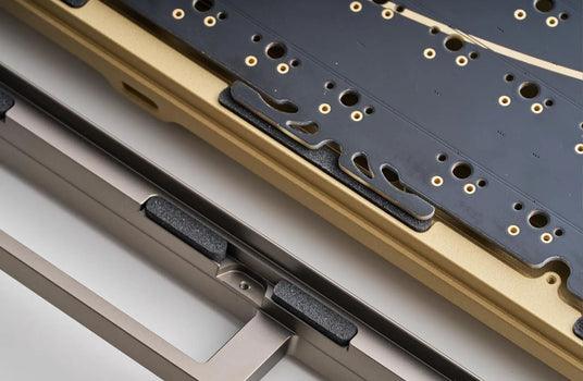 Like most Neo keyboards, the bottom case features a partitioned acoustic chamber to minimize hollowness. Forcebreak pads at all contact points reduce vibration and metallic noise, and combined with the copper base, deliver the deep, clean "copper bottom" typing sound that Neo fans love, without any foam.