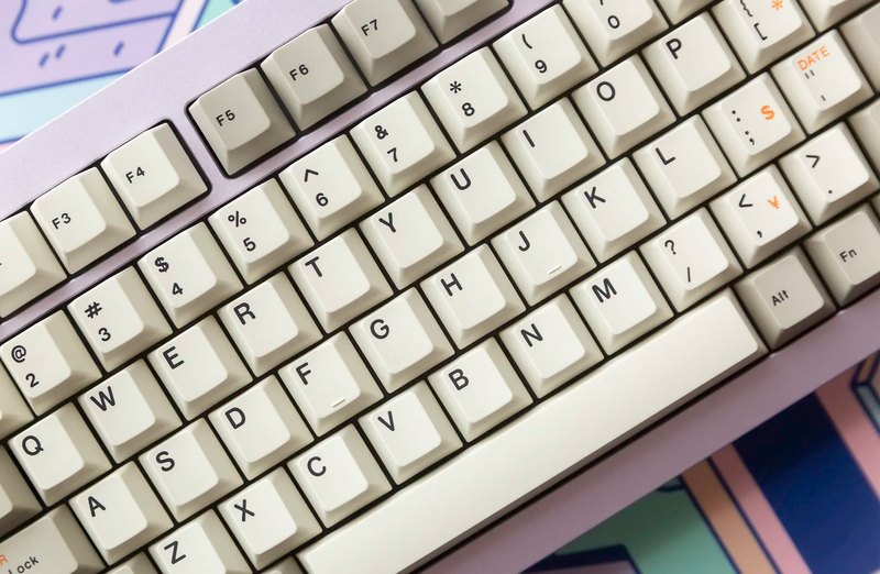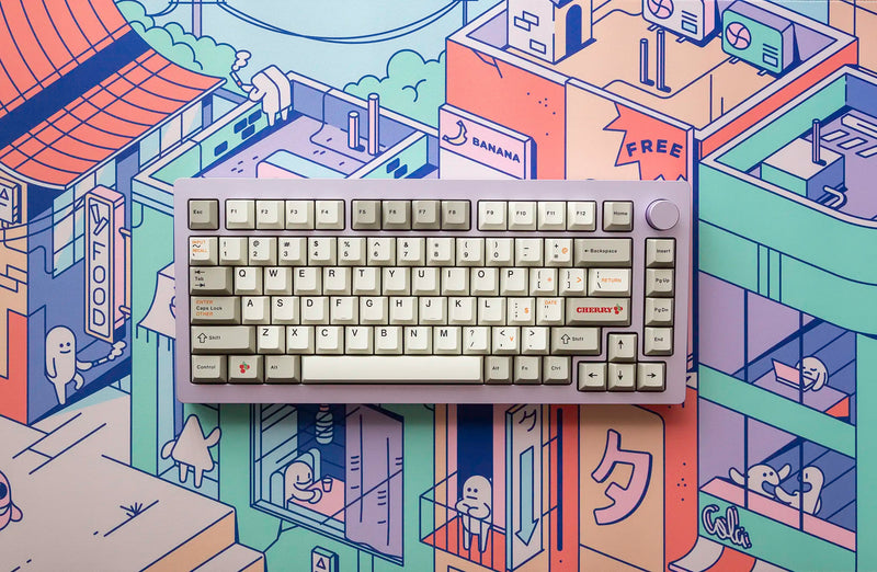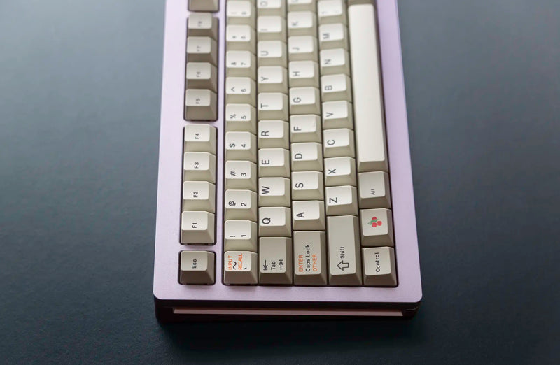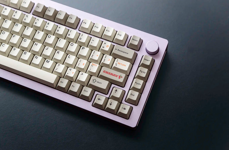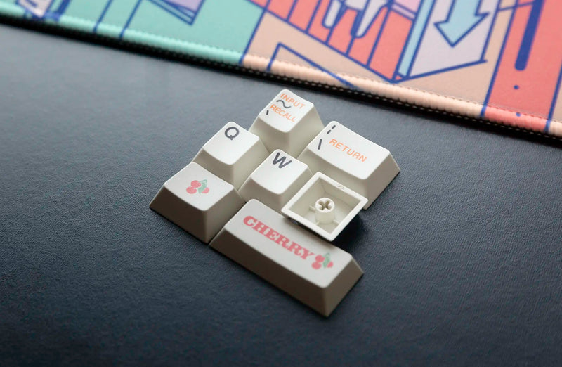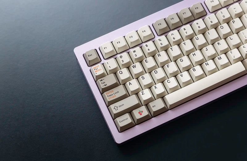 JC Studio Cherry Color Keycap Set features a classic beige colorway that has slight touches of orange sublegends on specific keys as well as a prominent "Cherry" for the Enter and Windows keys.