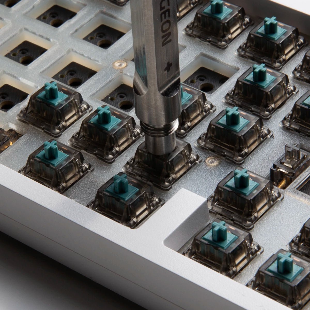 Geon Trimmer is used to calibrate the switch stem or keycap so that it will fit properly. An example of this is if the stem of the switch is too bulky to fit a keycap then the trimmer may be used in order to reduce the width of the switch stem.