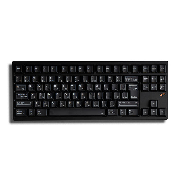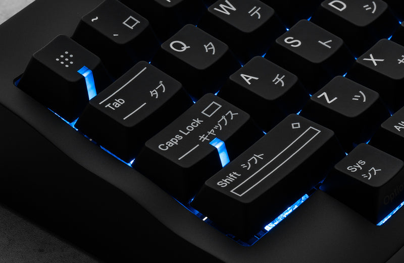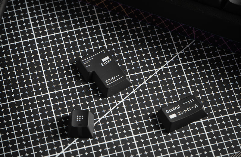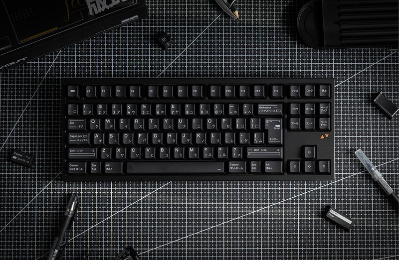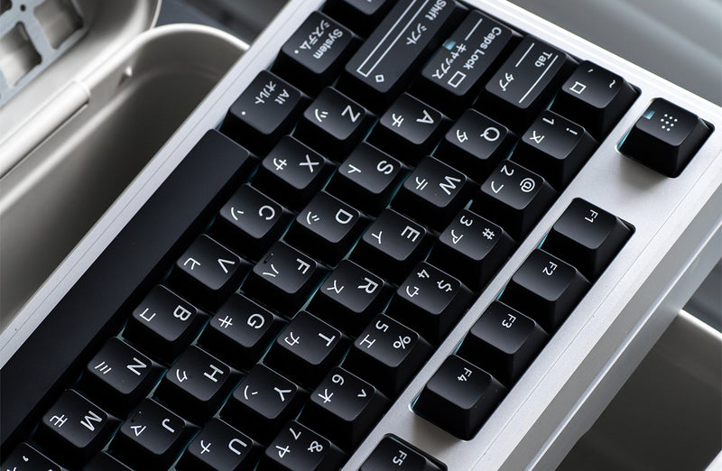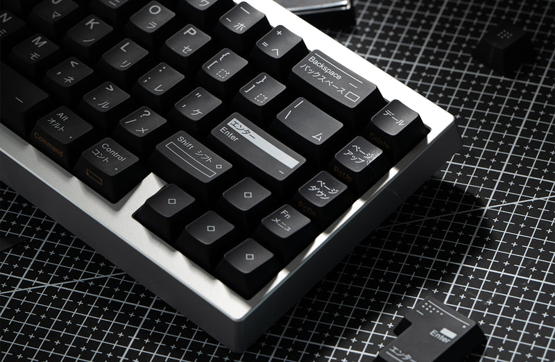 A Design Layout Keycaps is an interesting take on the classic White-on-Black set. Featuring sublegends for alphas and modifiers, small accent notes, relegendables, as well as shinethrough keycaps. ABS is also chosen in order to produce a deeper black than PBT can provide.