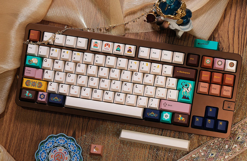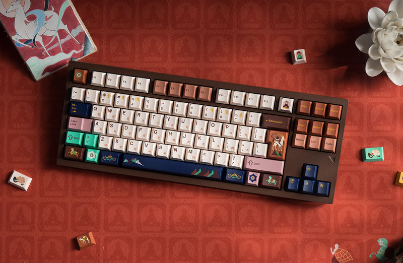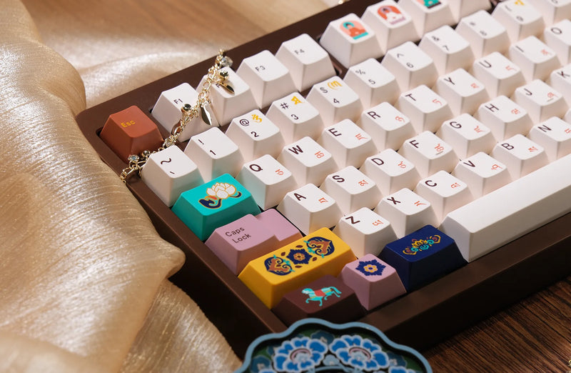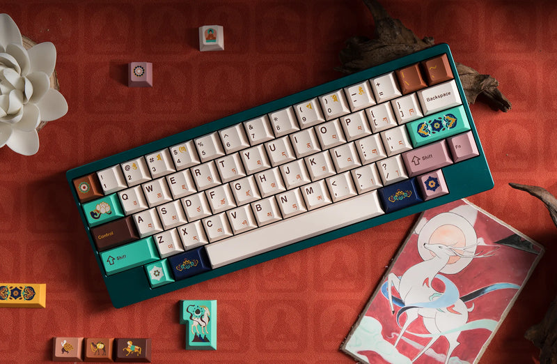 Keykobo Boundless Jataka Keycaps takes inspiration from the Deer of Nine Colors which is a story extracted from the Deer King Jataka paintings and lessons about justice, virtue, condemnation of evil. The color profile of the set is similar to these paintings from tasteful utilization of teal, blue, pink, and brown as well as the novelty art.