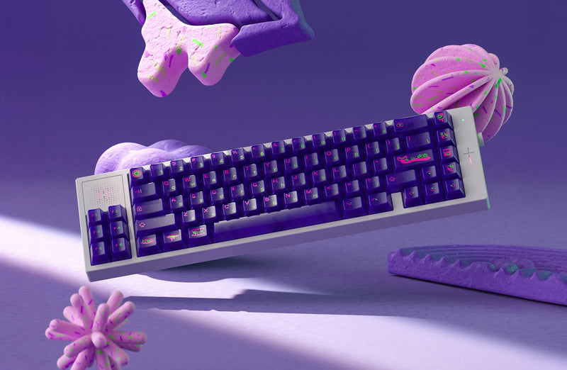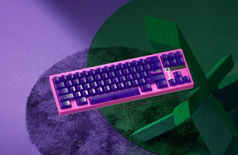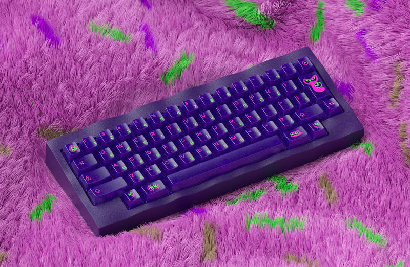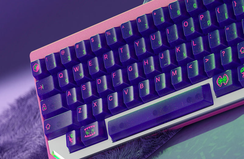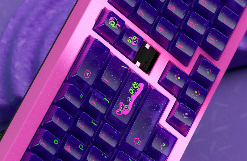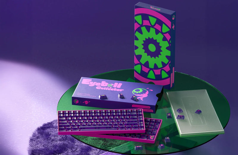 MW Eyeball Collector Keycaps encapsulate an eyeball eating monster with its purple transparent keycaps, neon pink and green speckles and legends, and themed modifiers.