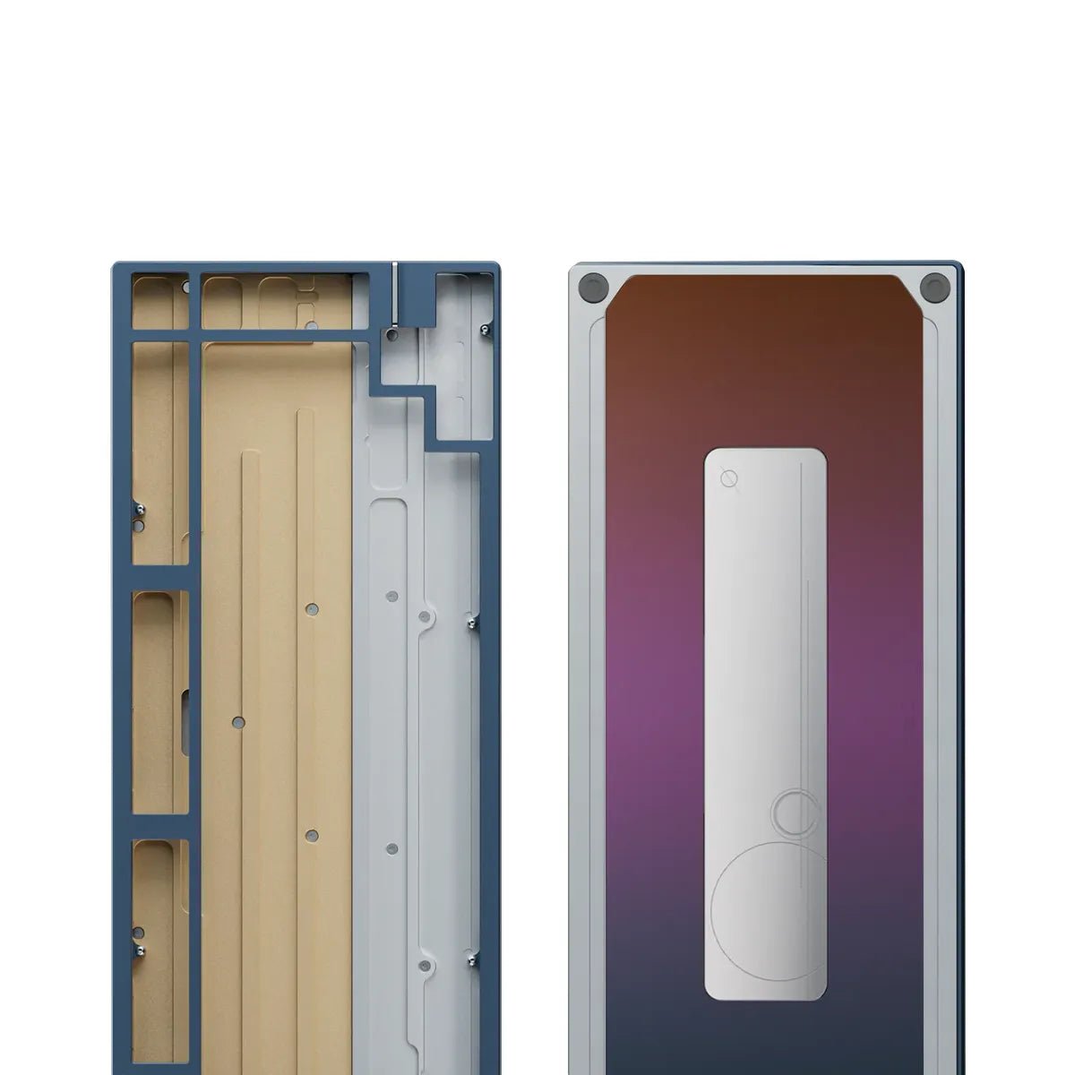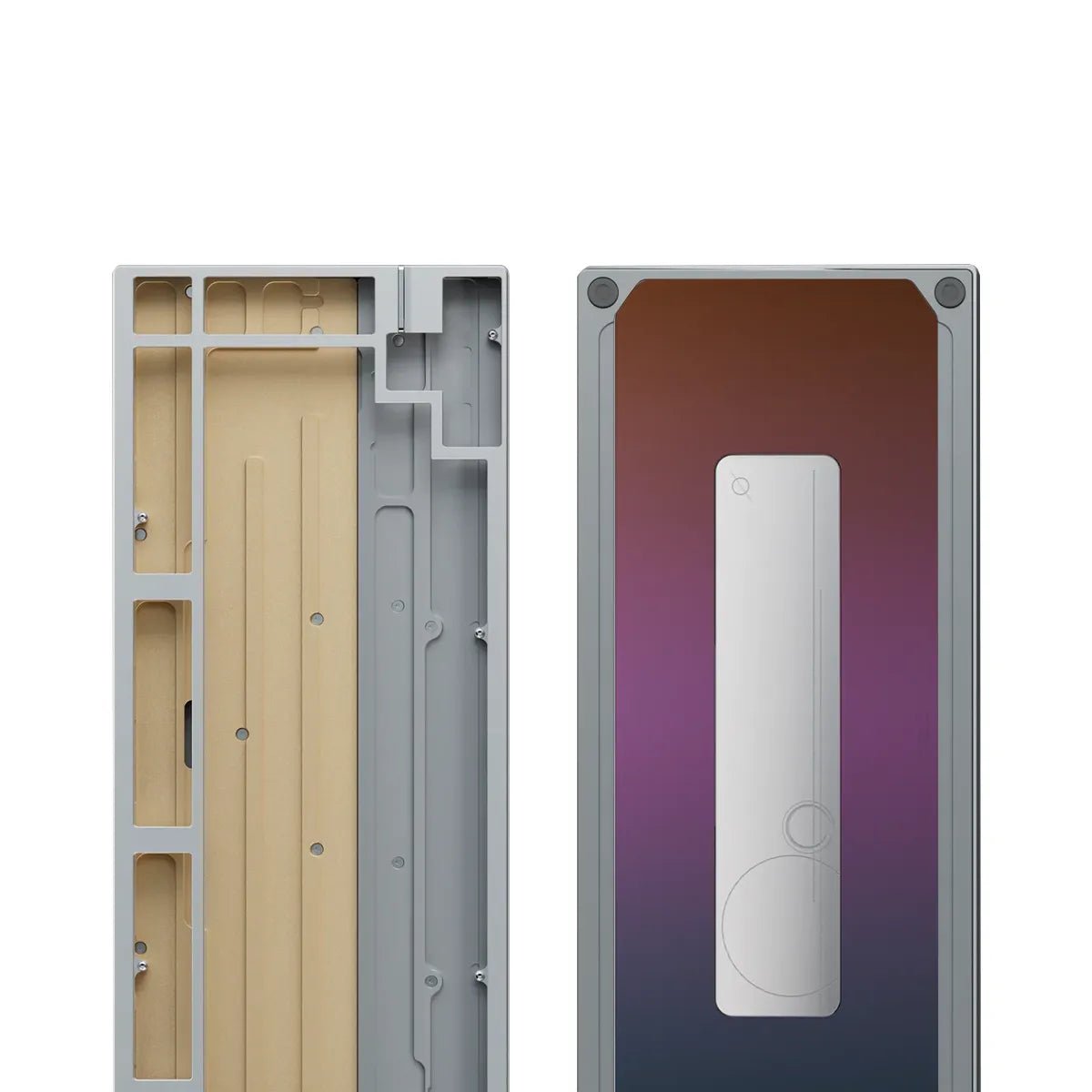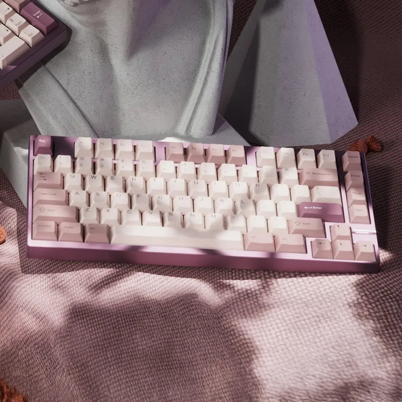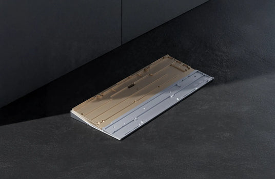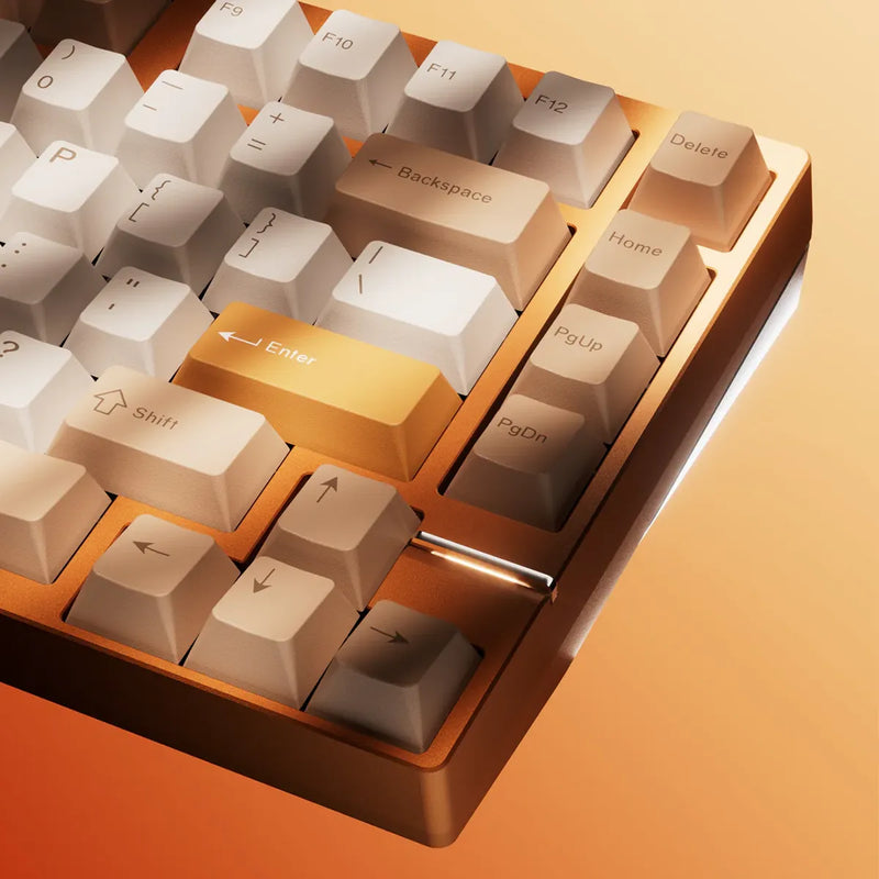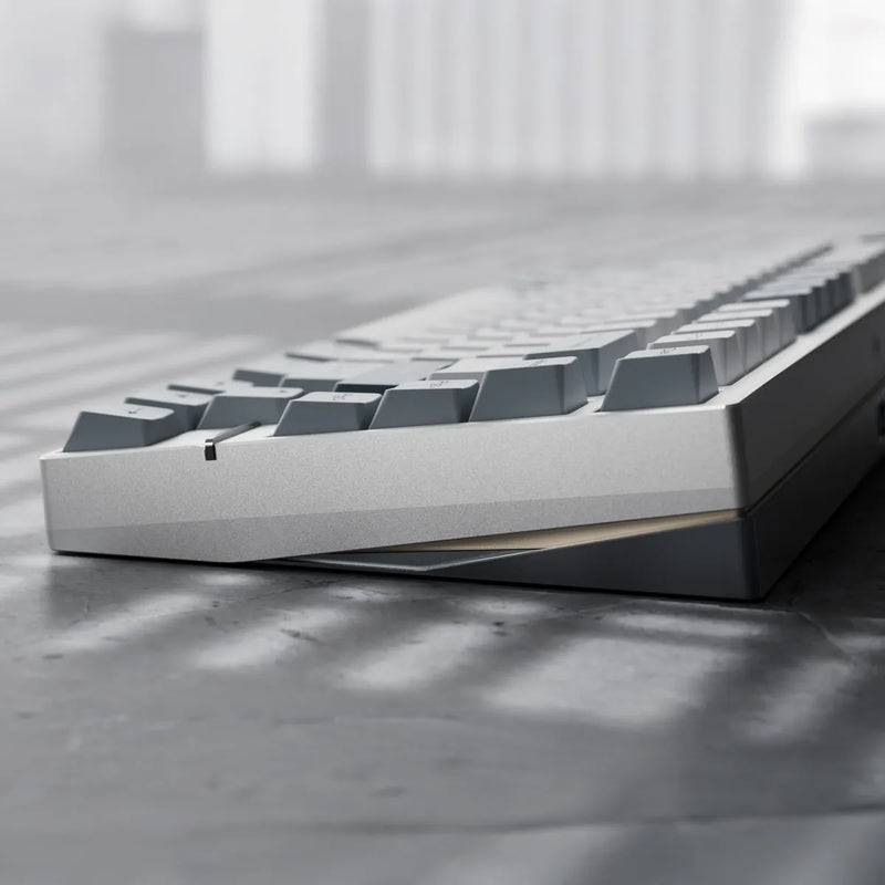 The keyboard features a stainless steel weight, available in spray-coated Gold and Silver with a soft, matte texture, or mirror PVD finishes inSilver, Gold, and Dusk. The PVD options offer a highly reflective surface, with the Dusk finish featuring a unique randomized gradient.