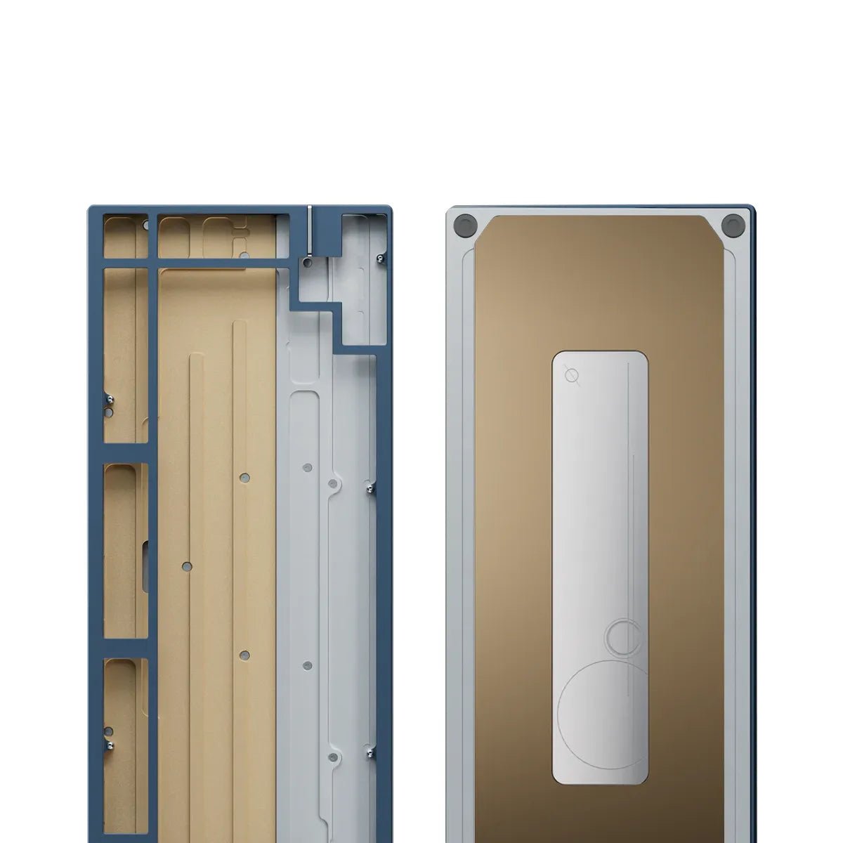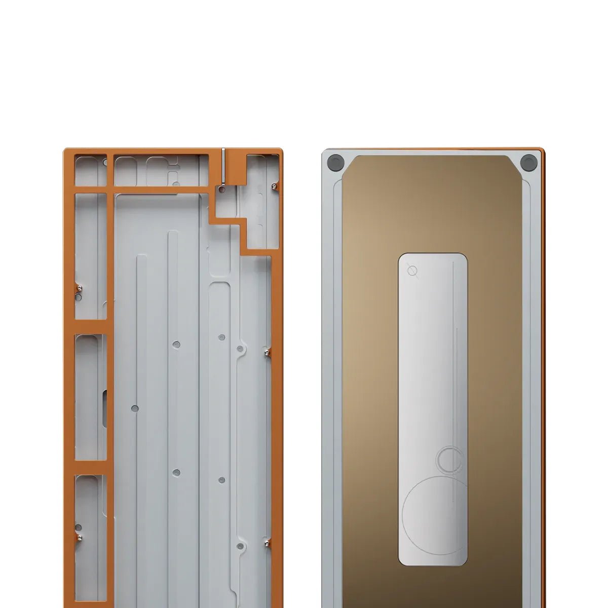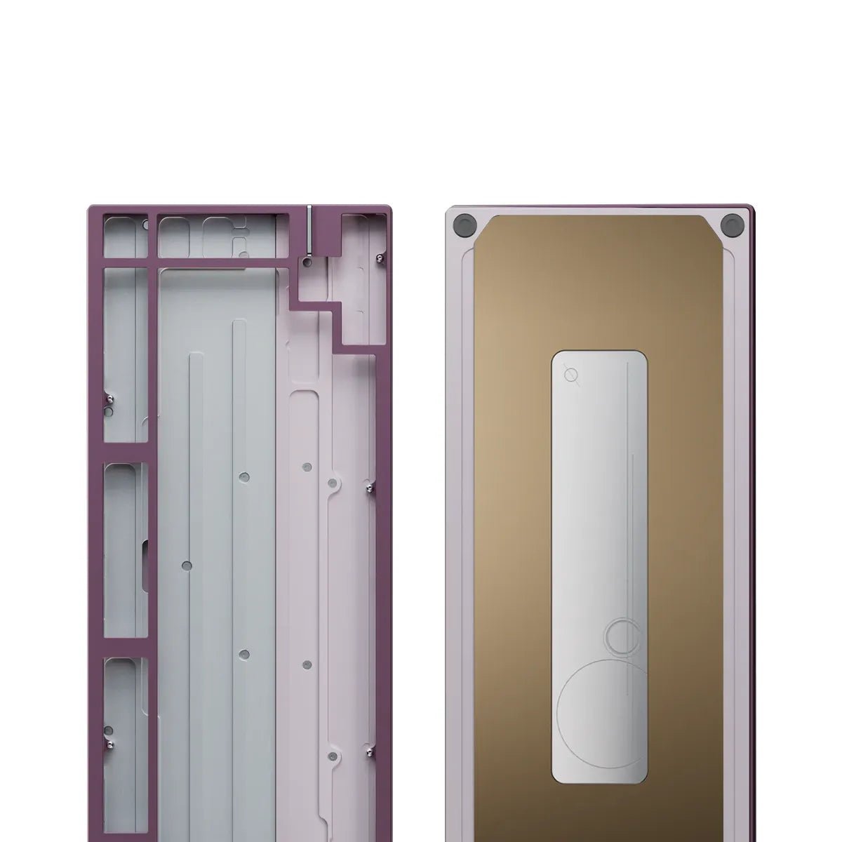 The keyboard features a stainless steel weight, available in spray-coated Gold and Silver with a soft, matte texture, or mirror PVD finishes inSilver, Gold, and Dusk. The PVD options offer a highly reflective surface, with the Dusk finish featuring a unique randomized gradient.