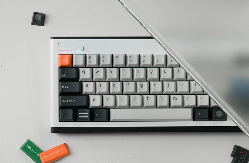 PBTfans Less But Better Keycaps have an emphasis on minimal yet elegant design with its font choice, lowercase legends, and monotone colorway as well as carefully designed novelties. Inspired by Dieter Rams' design who is a industrial designer most known for his Braun products.