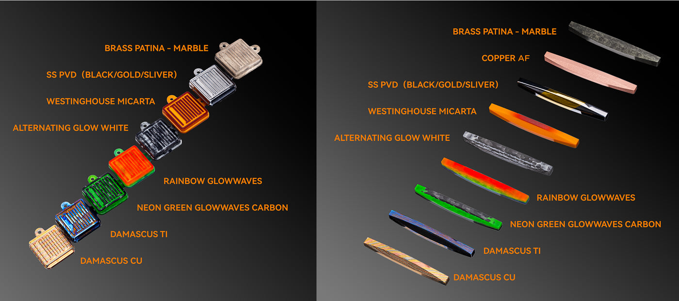 - Anodized Aluminum: Ching, Red, Blue, Green, Silver, Orange, Purple, Brown