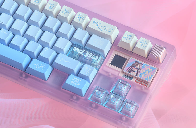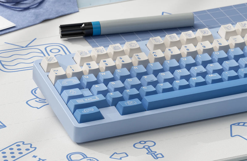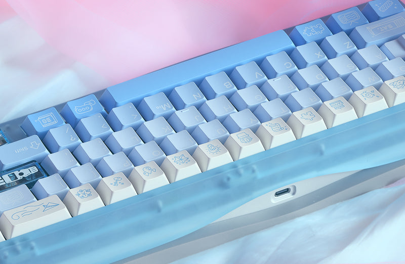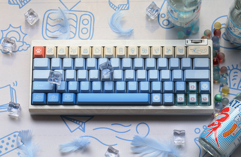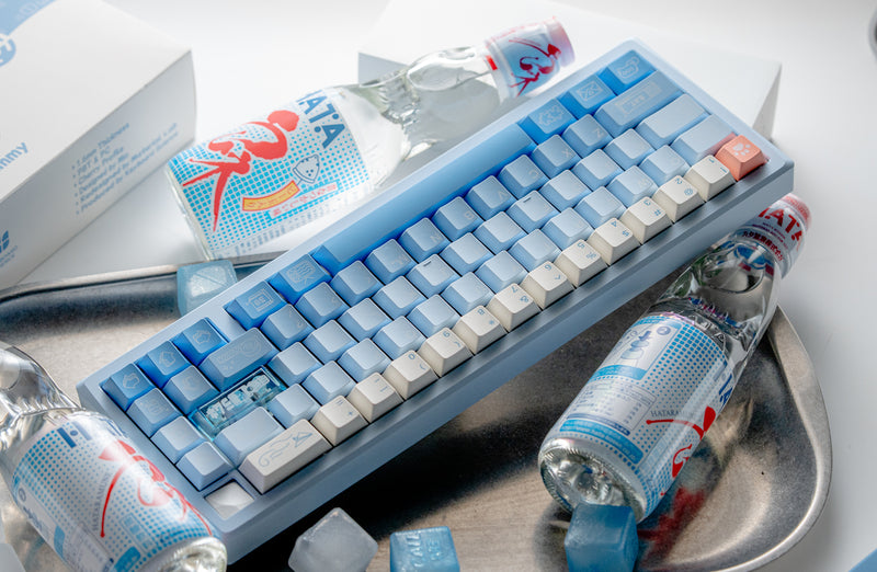 Keyboard Science Mio Soda Pop Keycaps takes inspiration from the popular japanese soda, Ramune. With its blue colorway and transparent novelties, it offers a great contrast in materials that fit the theme of the set.