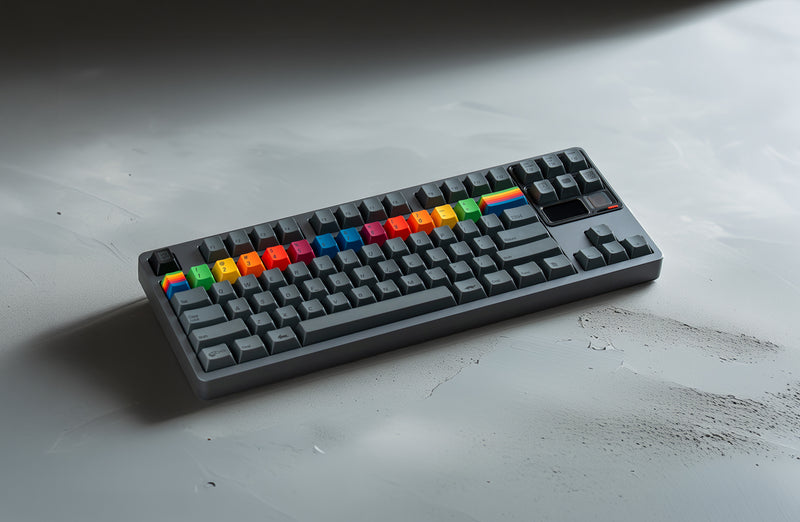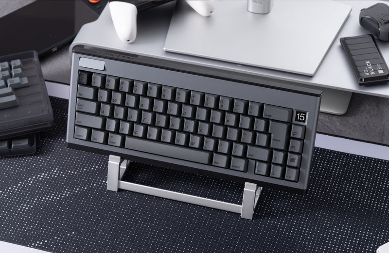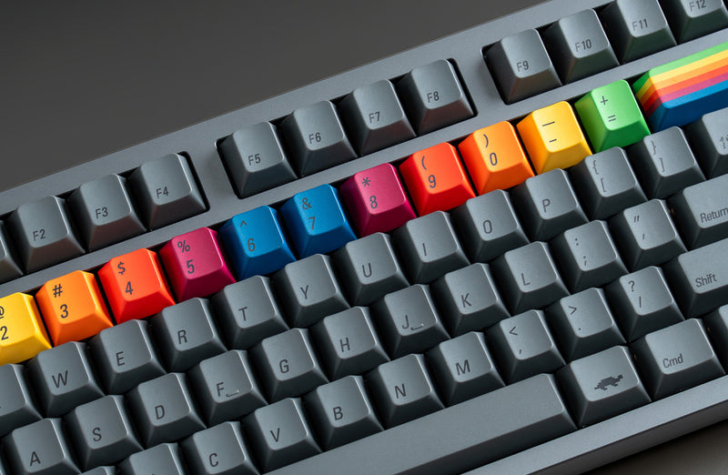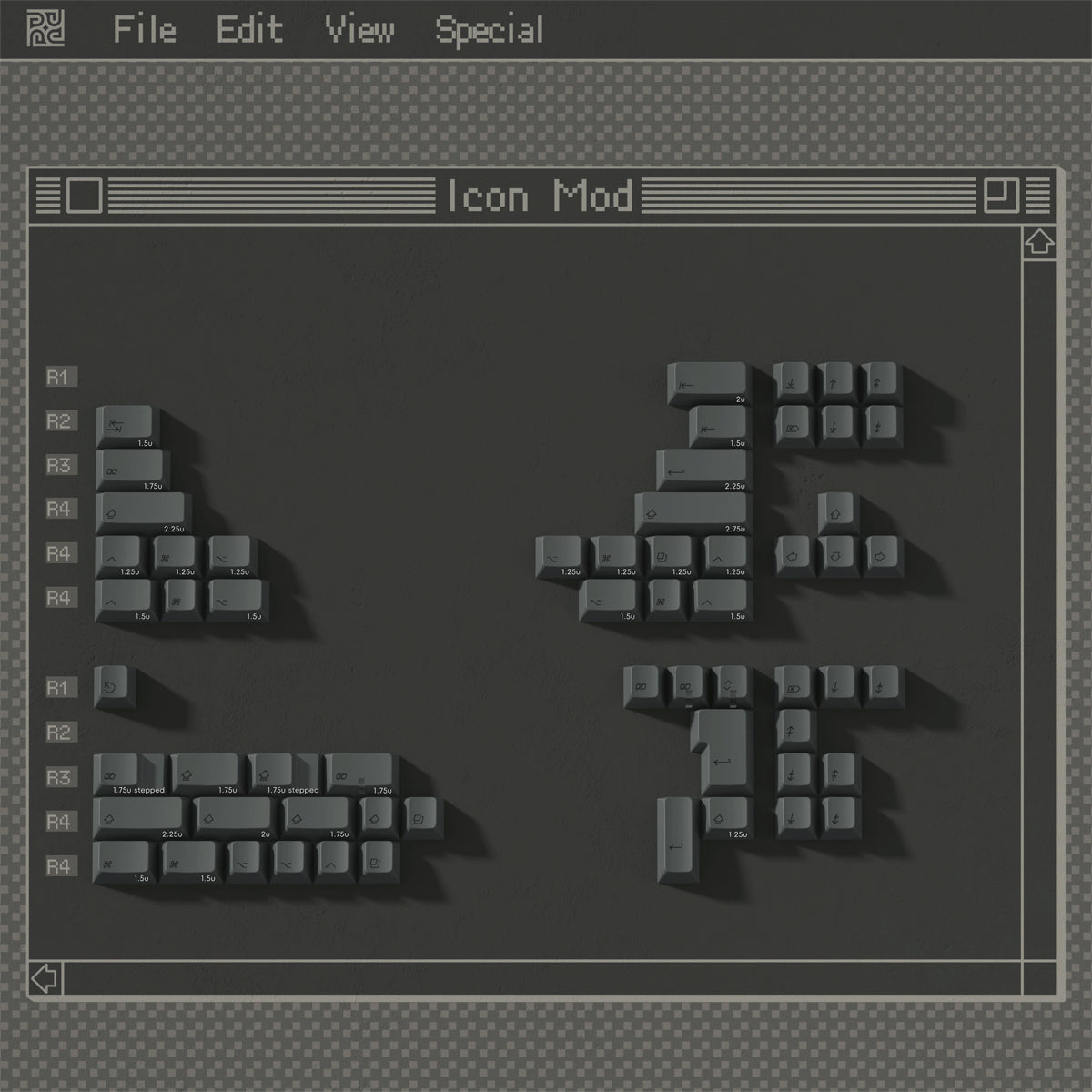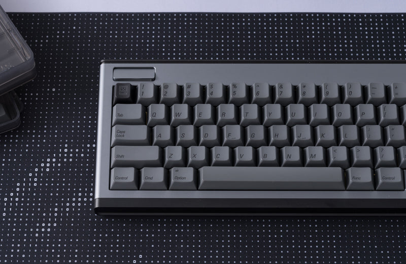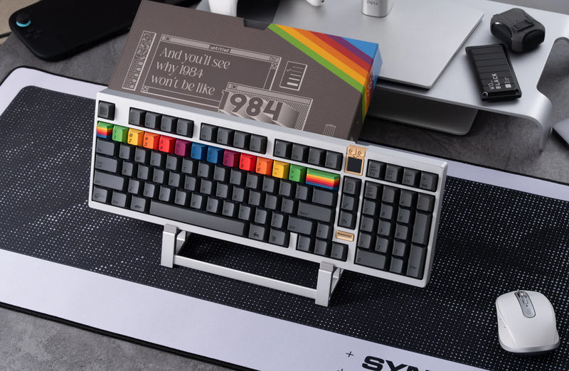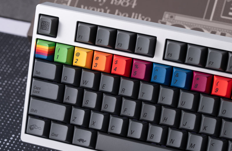 PBTfans 1984 Dark Keycaps are Mac compatible keycaps that follow after the popular release of the 1984 beige set. Now in a dark gray base and black legends with optional color addons.