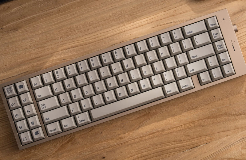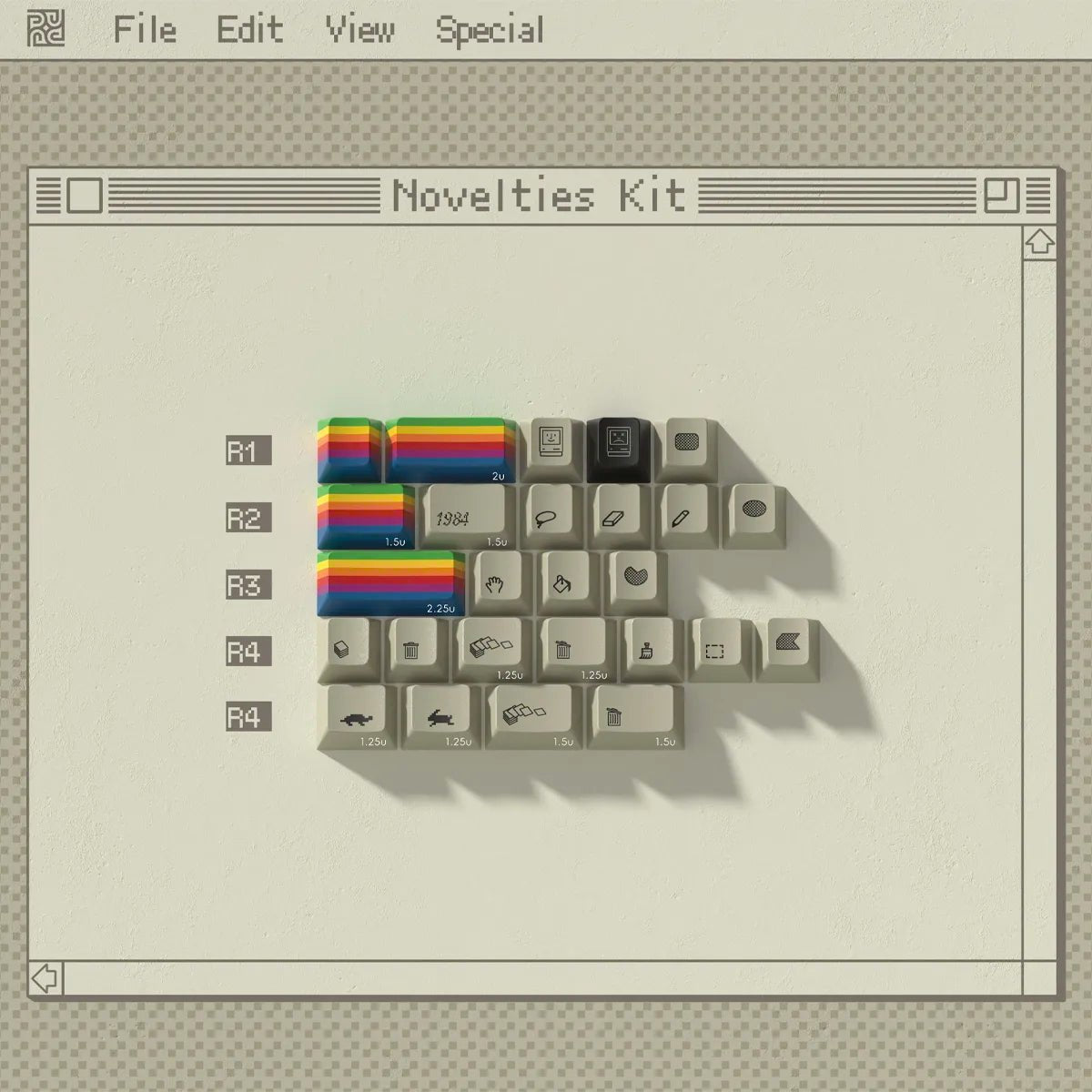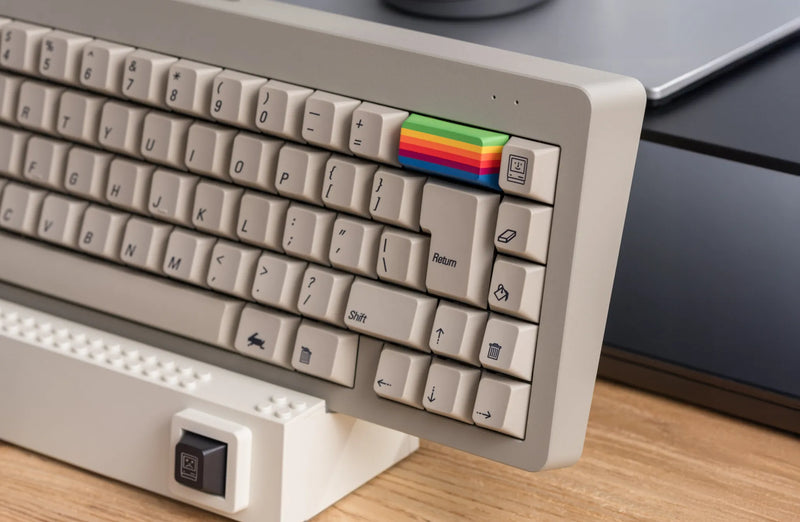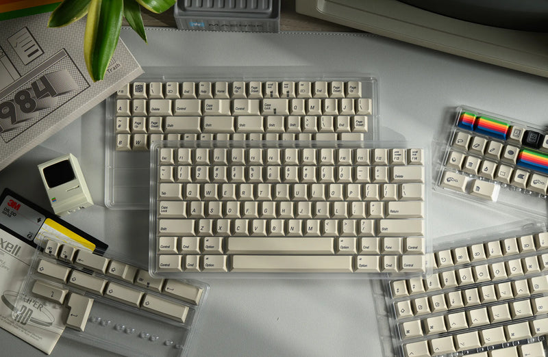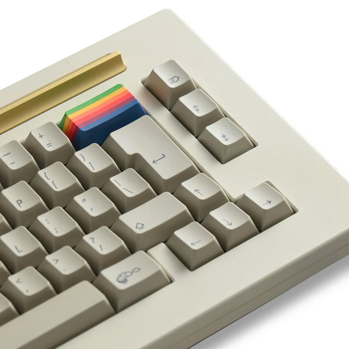 PBTfans 1984 Keycaps are Mac compatible keycaps that in a full beige set. Kittings are available for either icon mods, child kits, or novelties for a pop of retro color.