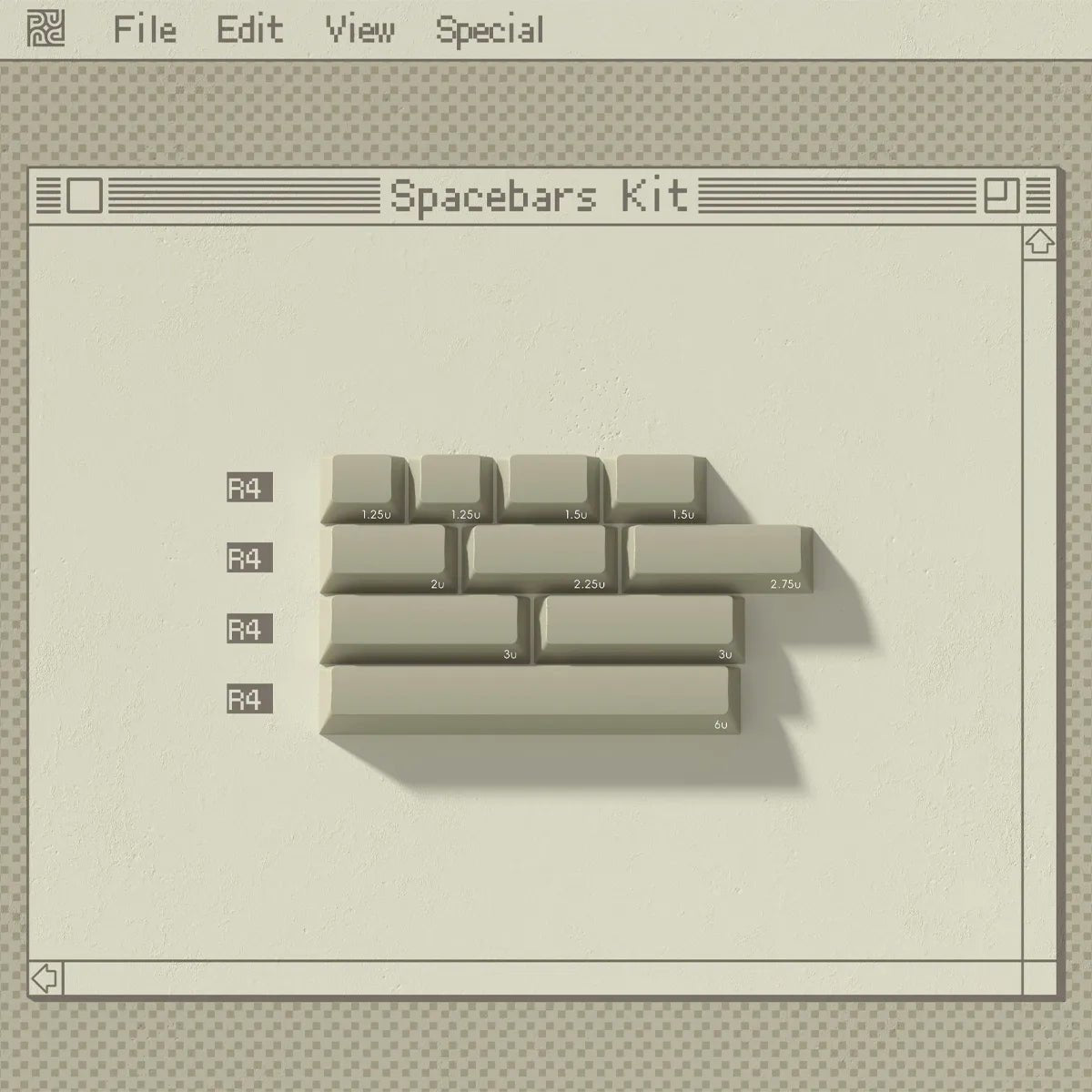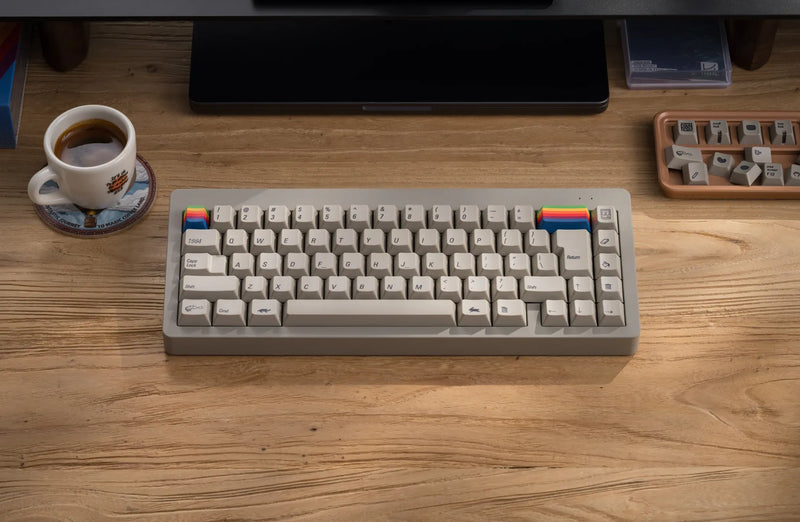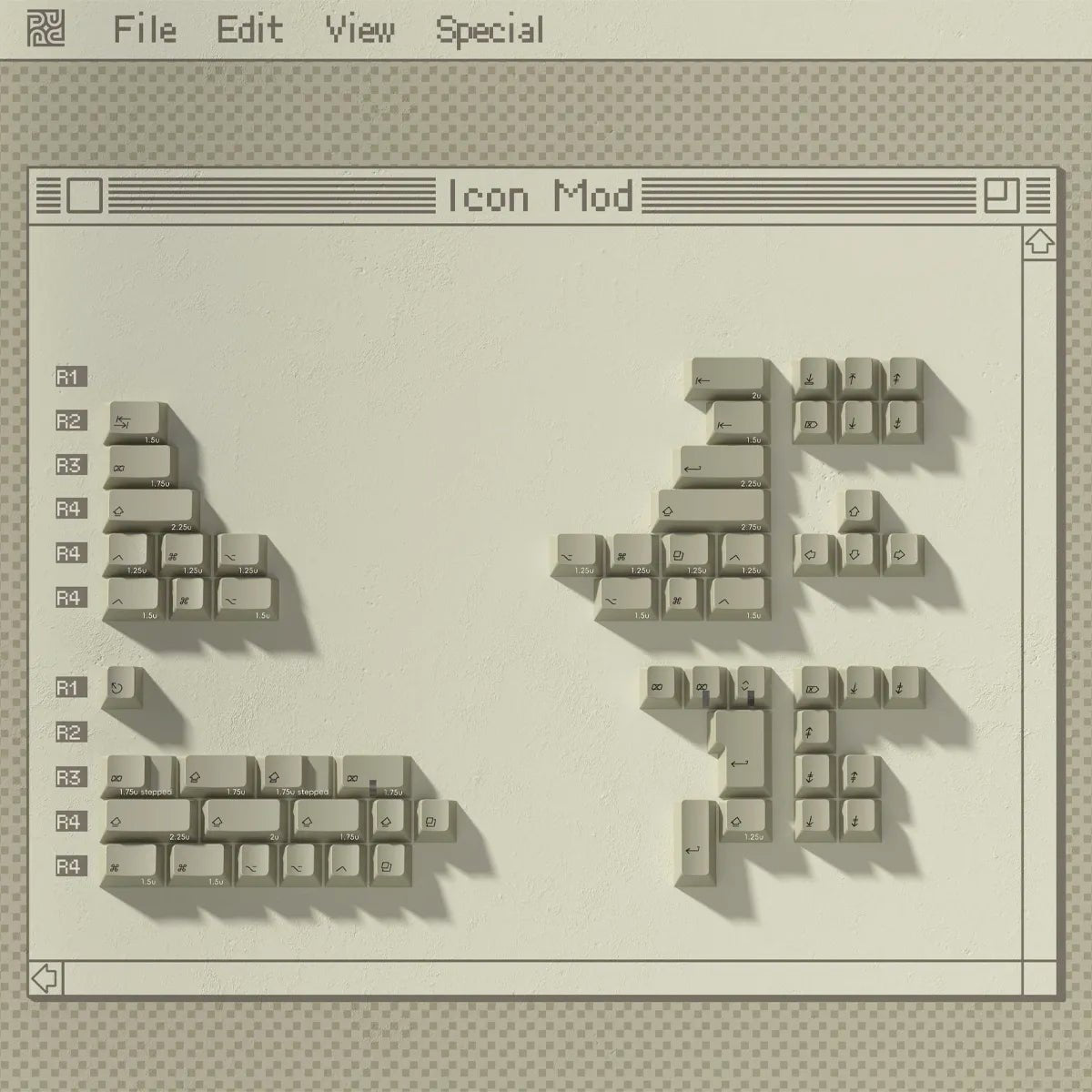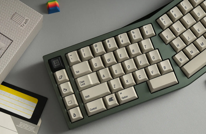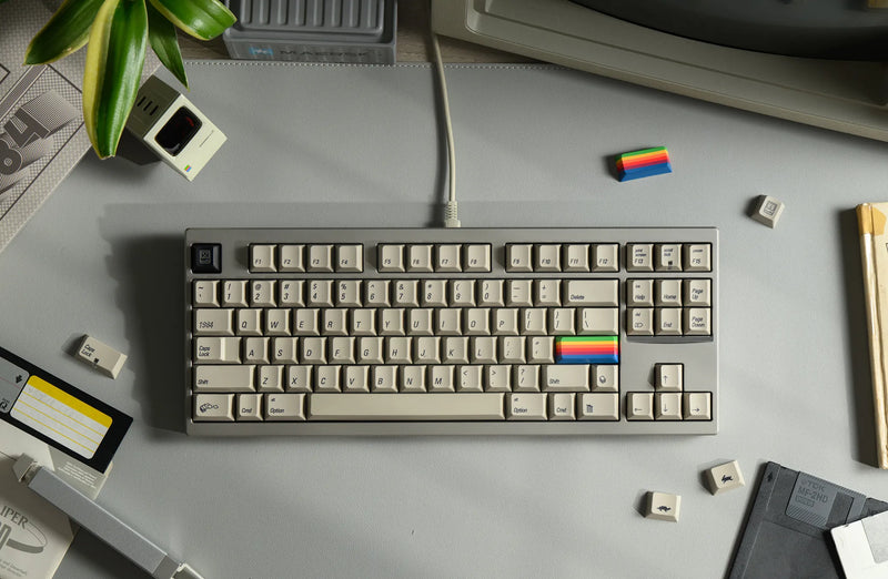 PBTfans 1984 Keycaps are Mac compatible keycaps that in a full beige set. Kittings are available for either icon mods, child kits, or novelties for a pop of retro color.
