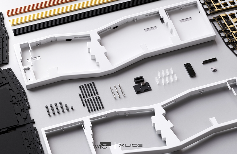 Wind Studio Xlice Keyboard is an alice+numpad layout keyboard with options for either standard configuration or southpaw (left or right numpad). The Xlice features Wind Studio’s design signature from the “X” logo, side profile, and layered bottom. It also focuses on build quality, from the leaf-spring mount to the incorporation of copper and brass elements for better sound and increased weight.