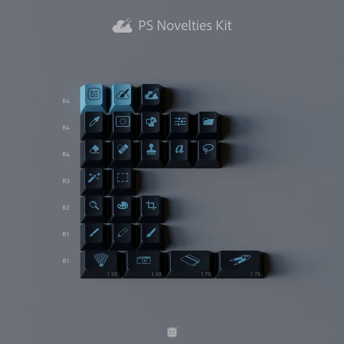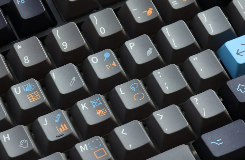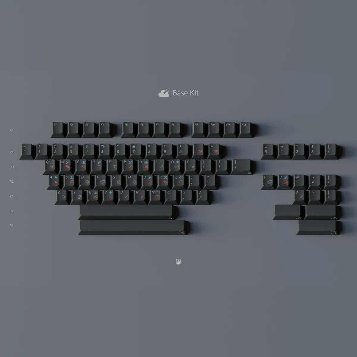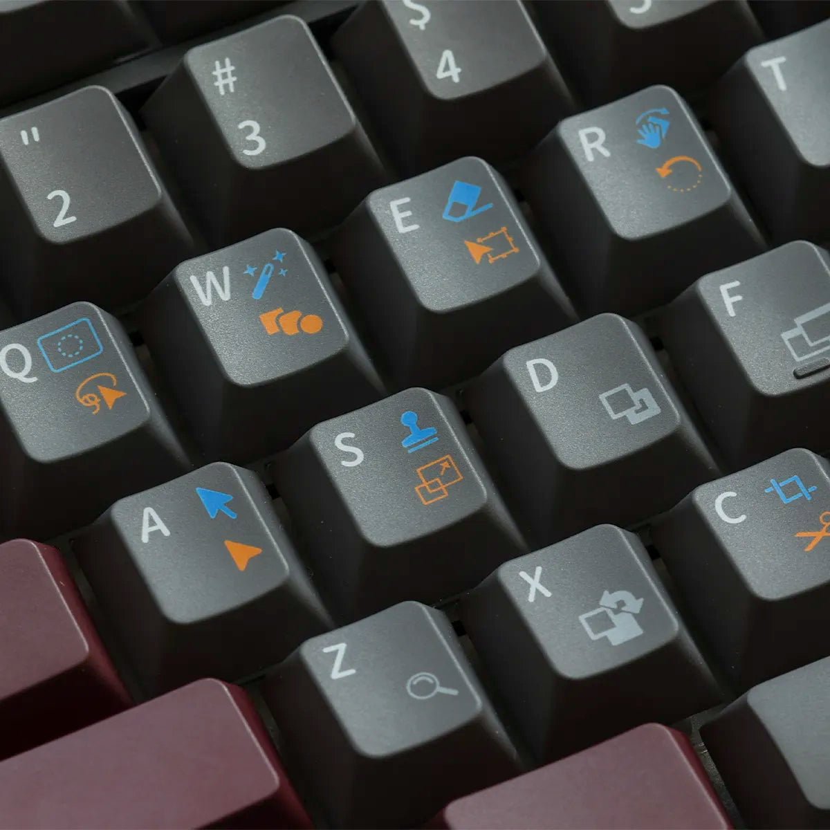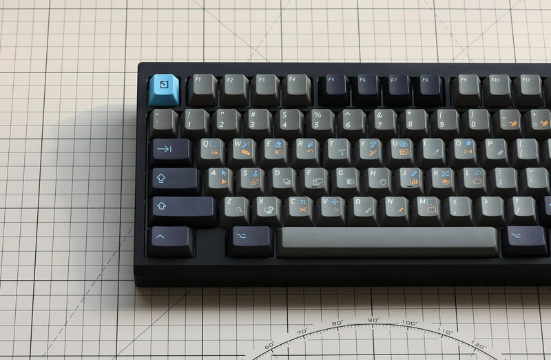 Introducing ePBT Creative Studio, a keycap set inspired by and featuring sublegends for your favourite creative tools. The set comprises dark grey alpha keys and two themed modifiers sets: a sky blue and navy PS theme, and an orange and maroon AI theme. ISO-UK is supported in the base alphas kit, and NorDe support provided via an extension kit. An extensive Nomad kit provides support for 40% and ortholinear keyboard layouts when paired with either alphas kit.