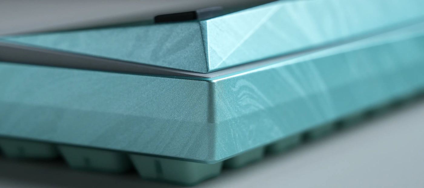 The side profile uses a three layer stacked design. Shaped by precision wire cutting and color blocking between the side and bottom case to add depth and structure.