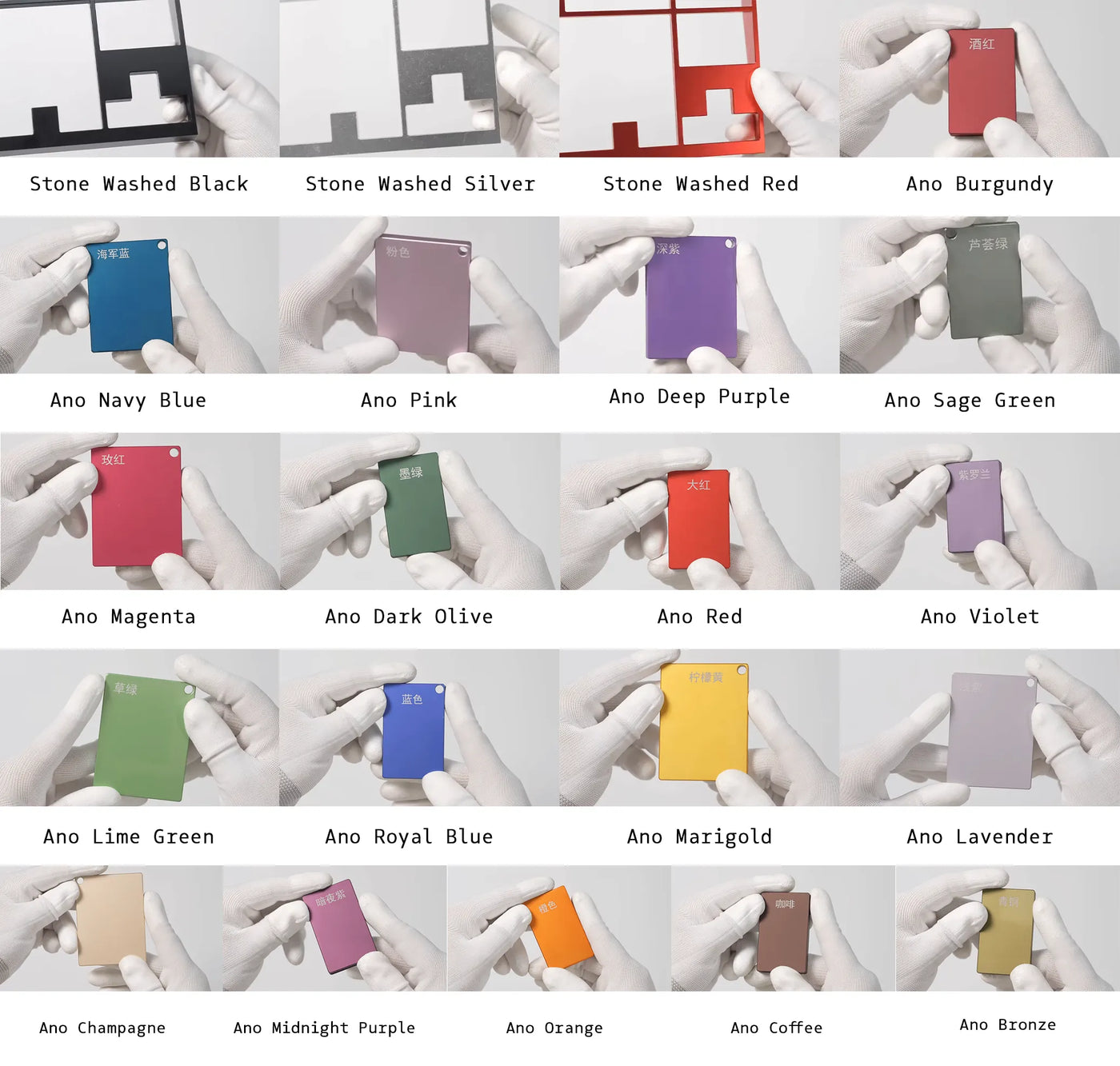 • Anodized: Black, Silver, Gray, Red, Rose Gold, Textured Black, Textured Silver, Textured Red