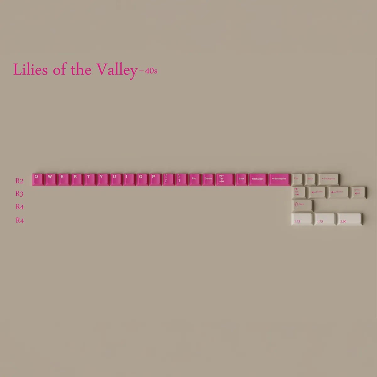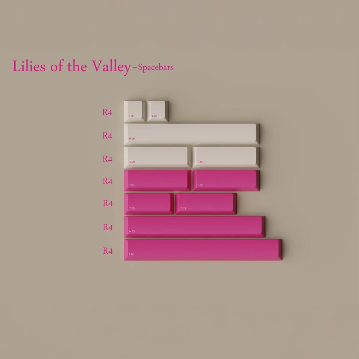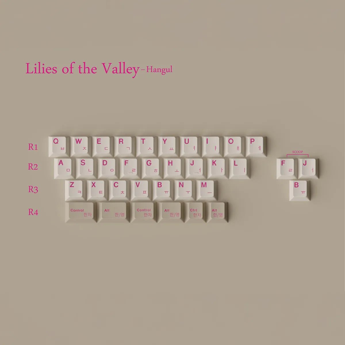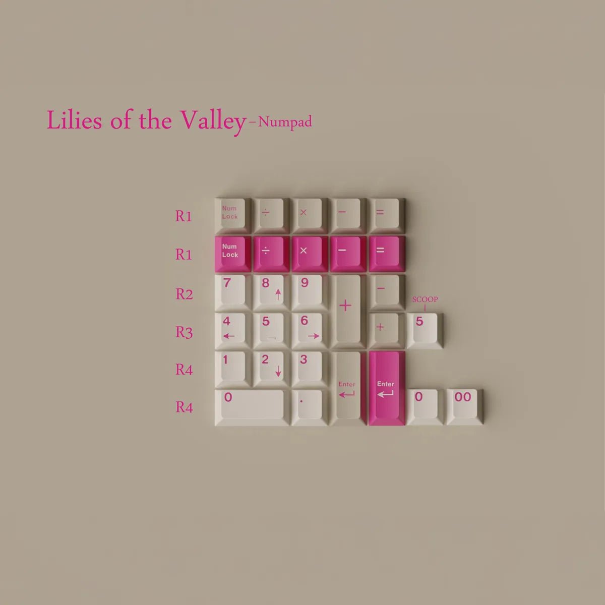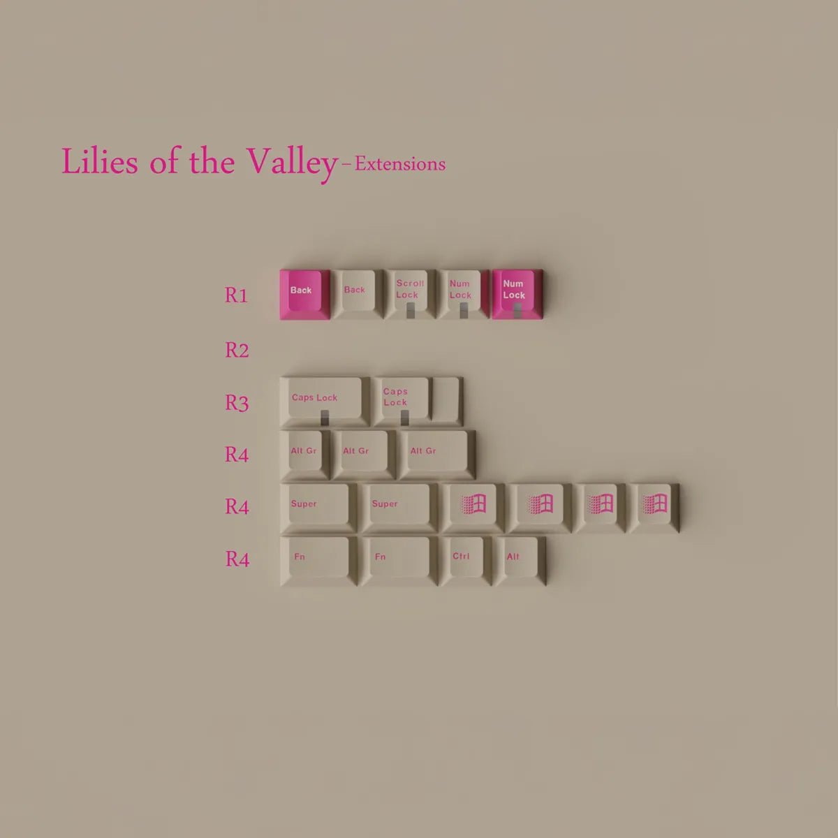 KKB Lilies of the Valley (LoV) takes on after the popularity of beige sets with a pink twist. This set features a comprehensive base set which includes both standard and alert num-row as well as multiple kittings to customize however you wish.