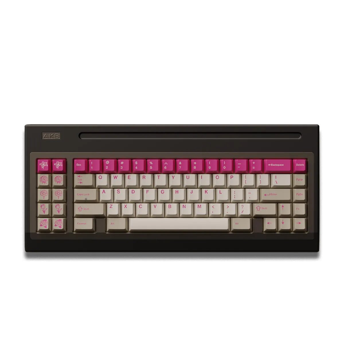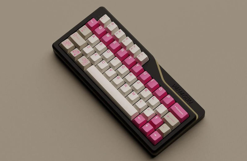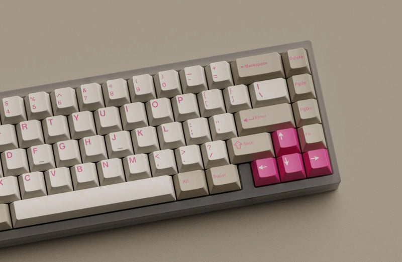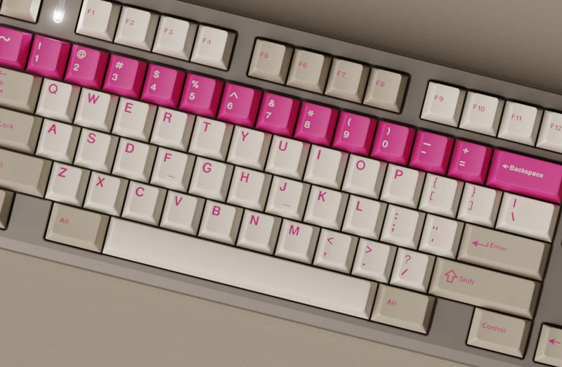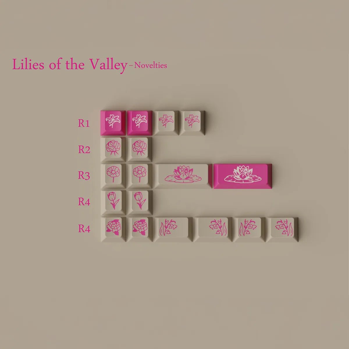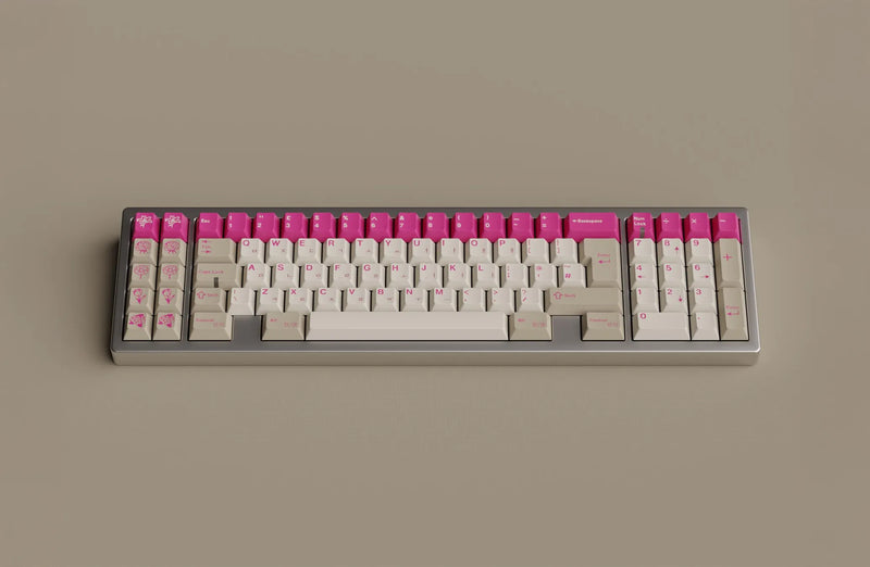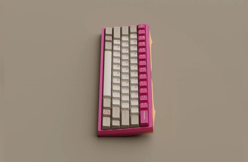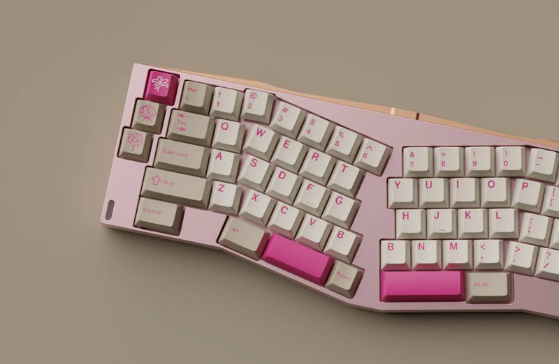 KKB Lilies of the Valley (LoV) takes on after the popularity of beige sets with a pink twist. This set features a comprehensive base set which includes both standard and alert num-row as well as multiple kittings to customize however you wish.
