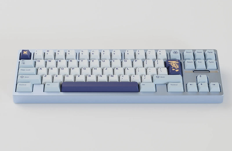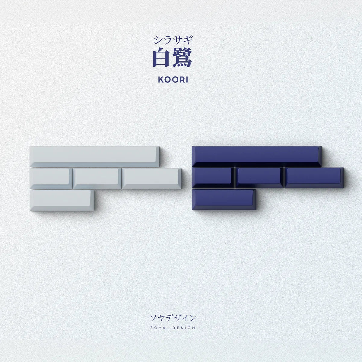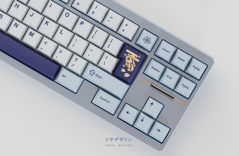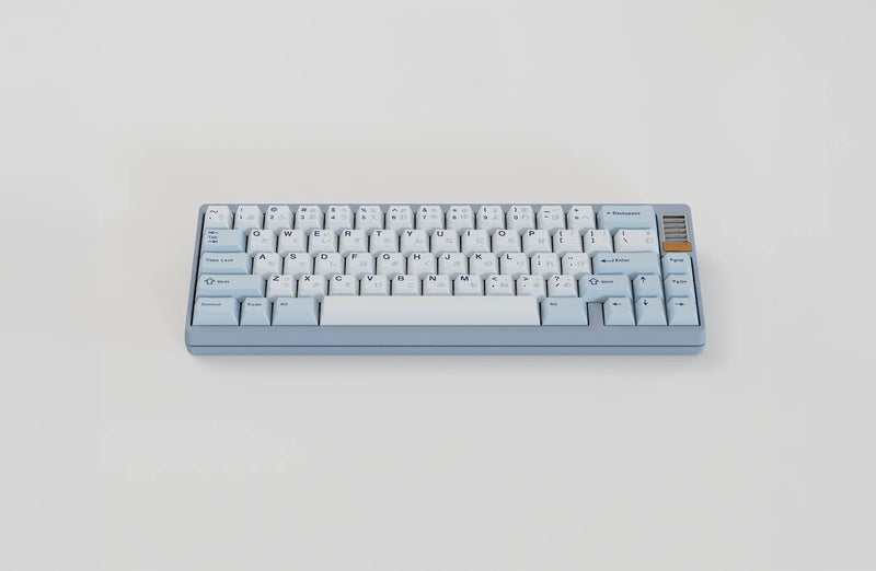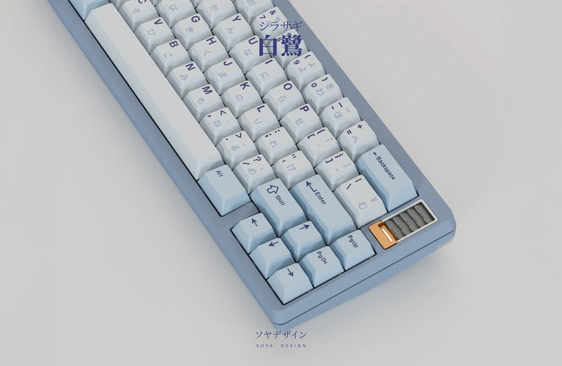Keykobo Shirasagi Keycaps showcases a vibrant, light blue theme with the option of a Latin or Hiragana base set. Coming in a doubleshot ABS material with UV printed Hiragana sublegends.