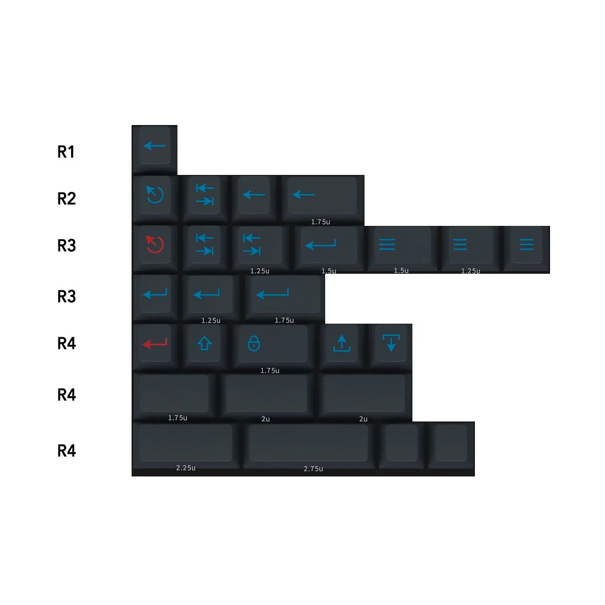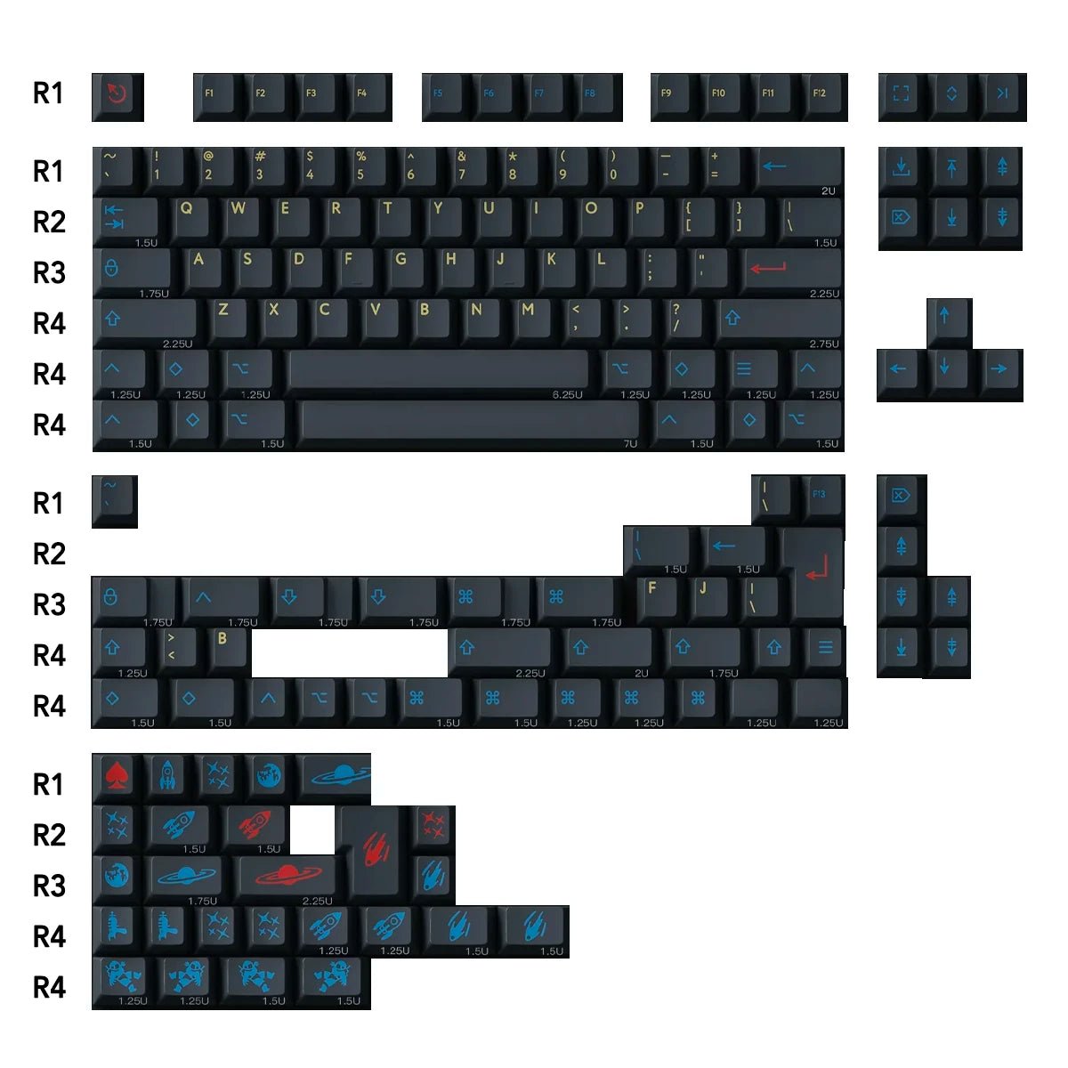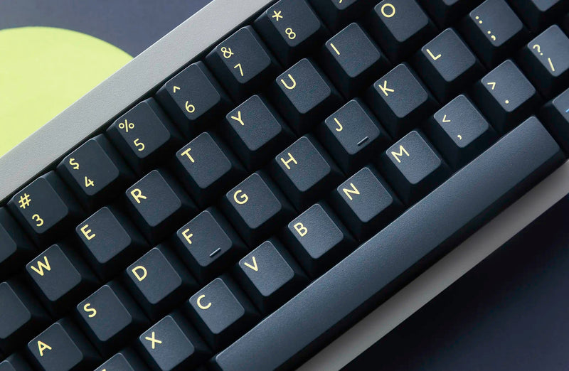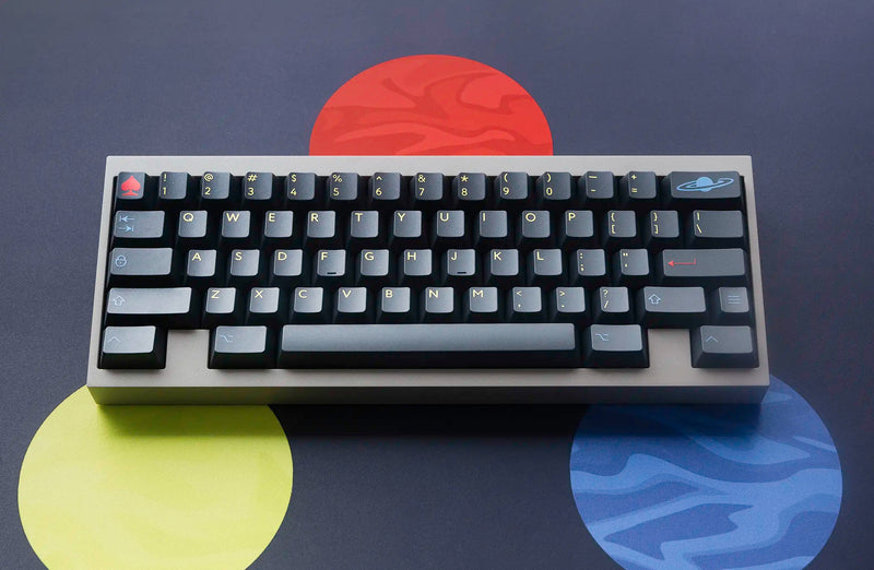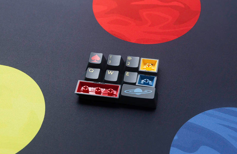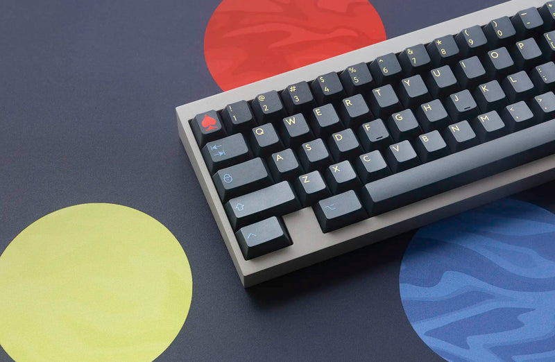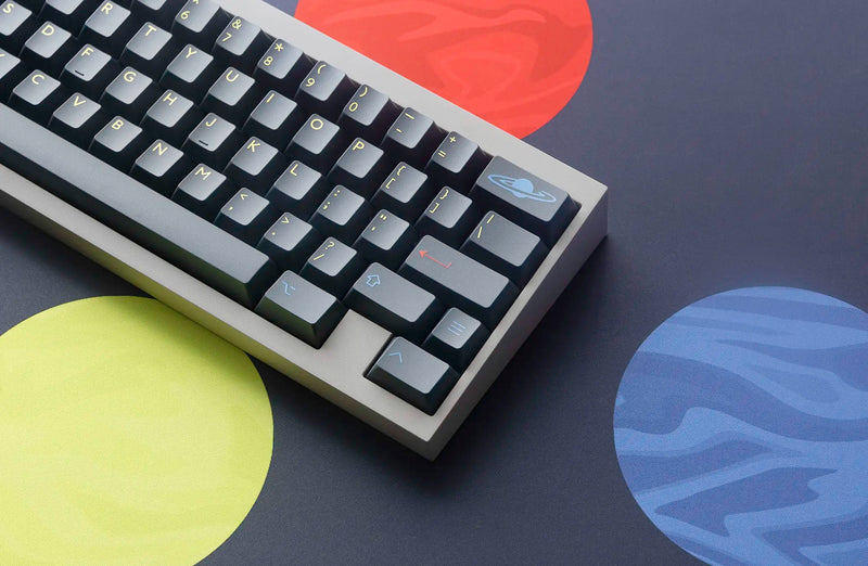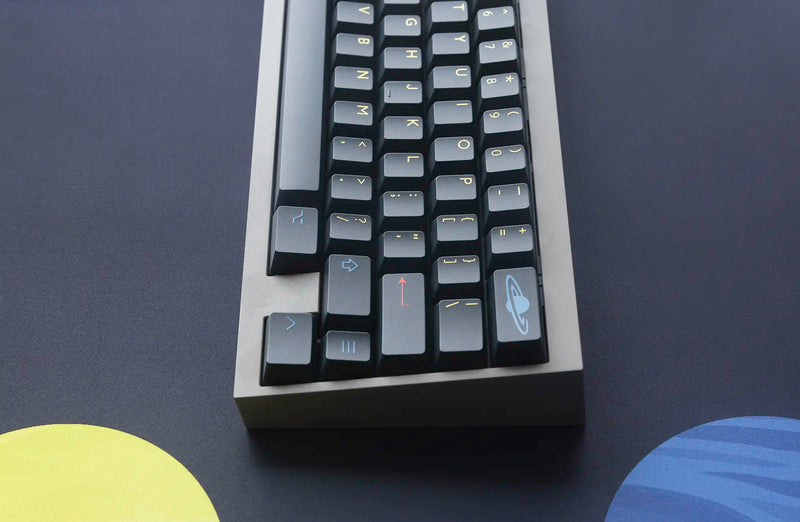 PBTfans Frontier Keycaps are inspired by space and it is shown through in all aspects of the set, from the color choices to the novelties. Showcasing a combination of comet red, starry yellow, and baby blue legends on a deep bluish-gray base.