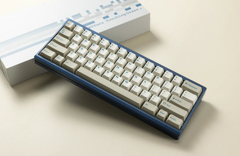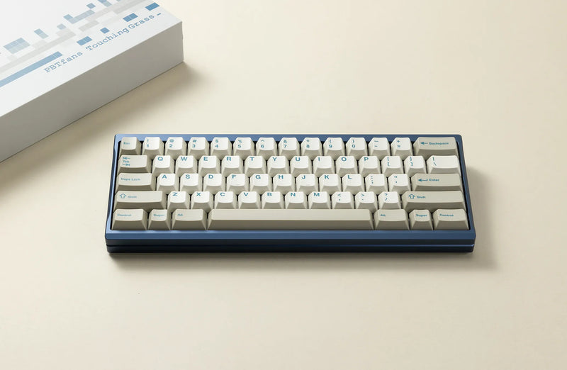 PBTfans Touching Grass Keycaps are standard beige keycaps with cyan blue legends utilizing PBTfan's blended PBT material for its unique, crisp sound and smooth texture. It also has the option for an alert accent kit.